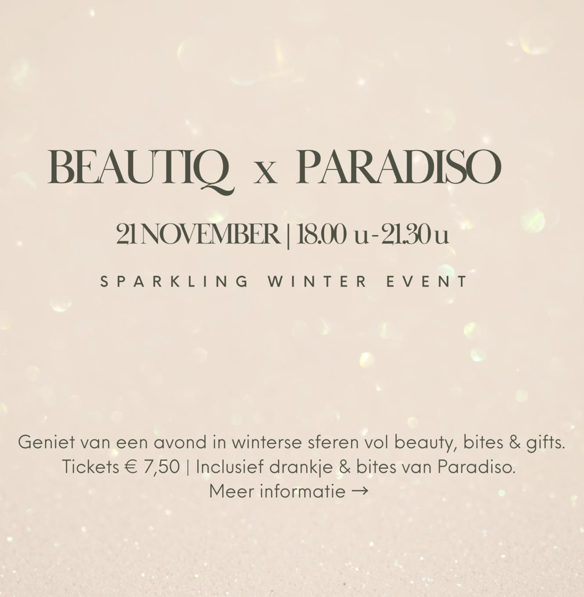 Onder het genot van de lekkerste bites van Paradiso & een winters drankje shop je de leukste decembercadeaus en accessoires. Er staan specialistes klaar voor de mooiste adviezen en er zijn leuke acties op jouw favoriete skincare & make up producten. Daarnaast kun je jezelf ook nog in de watten laten leggen met een cozy treatment voor je handen!